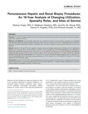 Angel W., Hawkins C.M., Wang J.M., Hughes D.R., Duszak R.. 2015. "Percutaneous Hepatic and Renal Biopsy Procedures: An 18-Year Analysis of Changing Utilization, Specialty Roles, and Sites of Service," Journal of Vascular and Interventional Radiology, 26(5): 680 - 685.